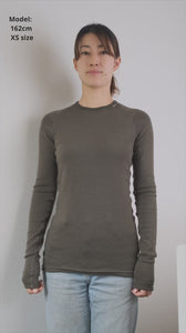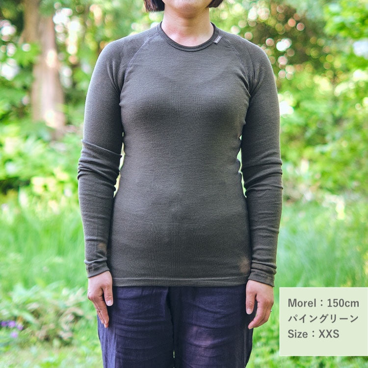 ウールパワーのウェアの中でも最も薄い生地の「LITE」シリーズは、肌に最も近い位置で着用するベースレイヤー。春秋冬はミドルレイヤーやアウターとバランスを取りながら、体温調節をするのに重宝するほか、夏場は高地でのキャンプや登山でも活用することができます。薄手なので重ね着しても上着に響きづらく、タウンユースでも活躍します。クルーネックLITEは長袖タイプで、バックパックを背負っても干渉しないようにラグランスリーブ仕様になっています。また、屈んでも背中が出ないように後ろ見頃が長めに作られています。