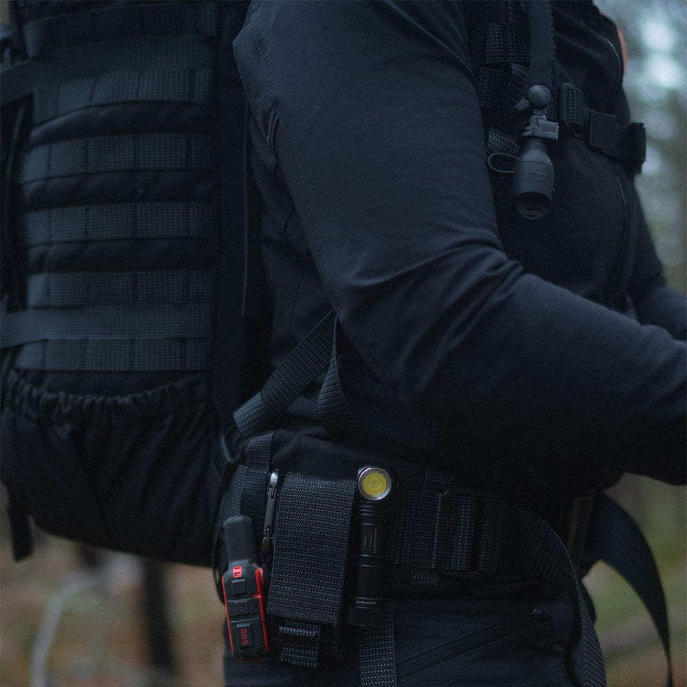バックパックのフロントとサイド、ボトムに満遍なく取り付けられたモールシステムが付属。ポーチ類を組み合わせたり、カラビナやバンジーコードを取り付けることで、小物をひっかけたり、レインウェアやタープを運搬したりと、便利に外装を活用することができます。より自分好みの工夫を加えて、使いやすく進化させてみてください。