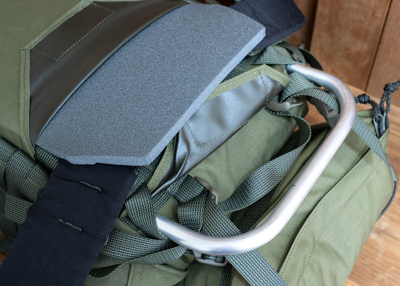 背面にあるポケット (奥) には、チューブ状のアルミフレームが標準装備。 フレームが入ることでパックの成形が安定し、パッキングが整うほか、安定した運搬を実現。