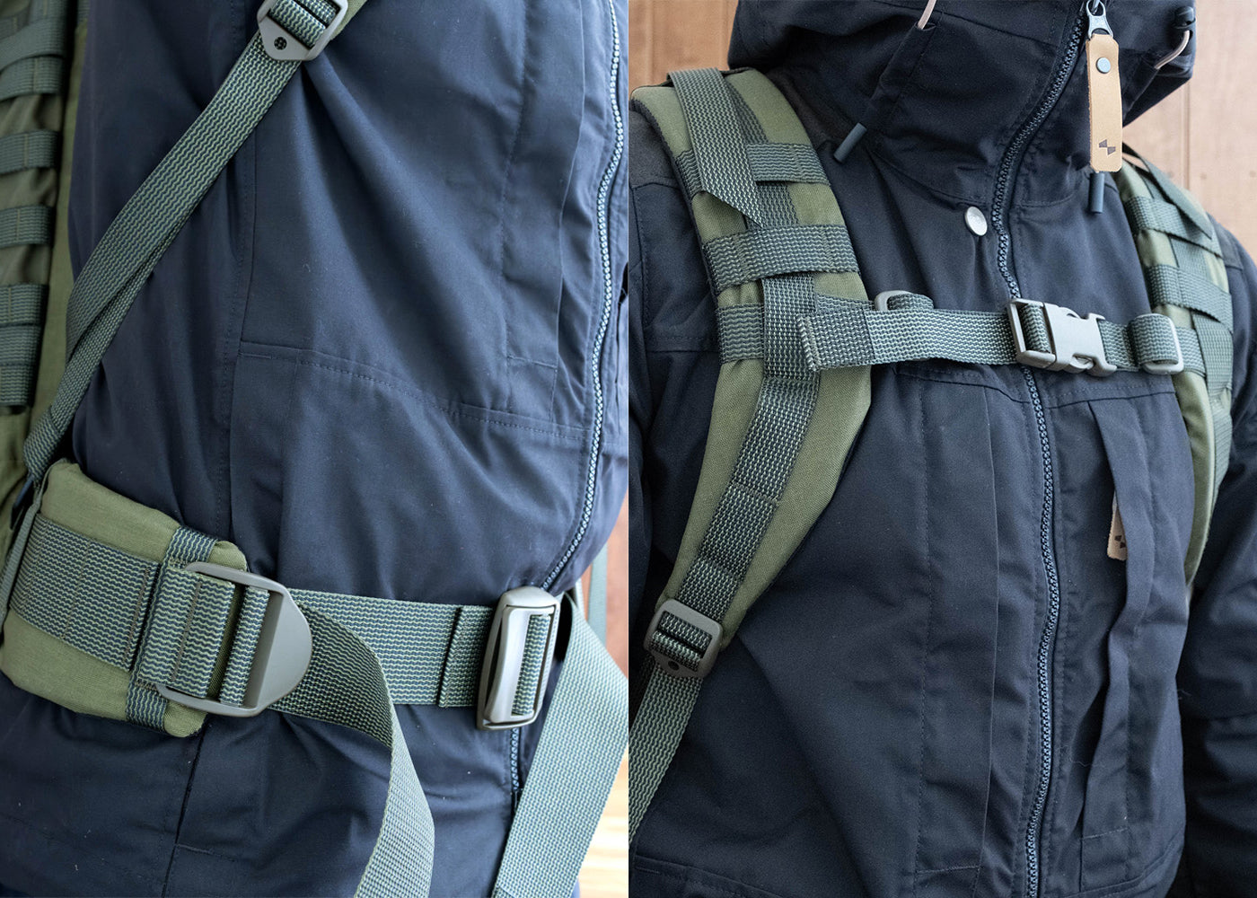 ウレタン入りのパッドとウェビング付きでカラビナなどを取り付け可能。可動式のチェストストラップと、本体を体に引き寄せ、荷重を分散するロードリフターストラップが付属。ショルダー下部はスチールリングでの接続で動きもスムーズに。