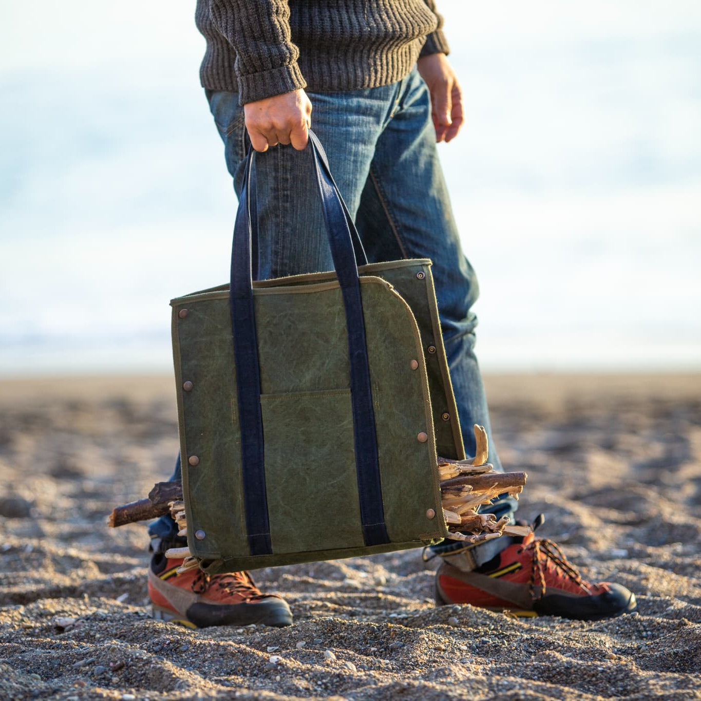 バッグのサイドにはスナップボタンが付属しており、それらを外して側面を中に折り込めば、ログキャリー(薪を運ぶバッグ)としても活用が可能です。解体したバッグにそのまま薪を置いておけば、地面からの湿気を吸うことなく薪や火口(ほくち)を乾燥した状態で置いておくことができます。