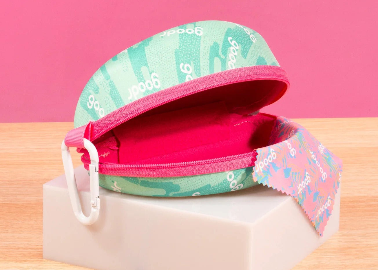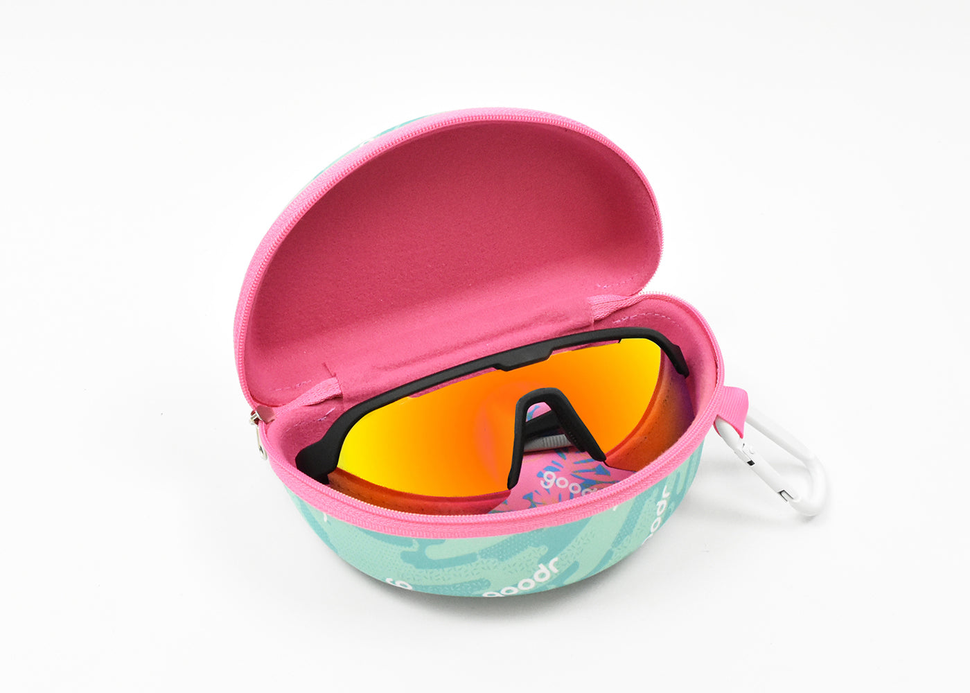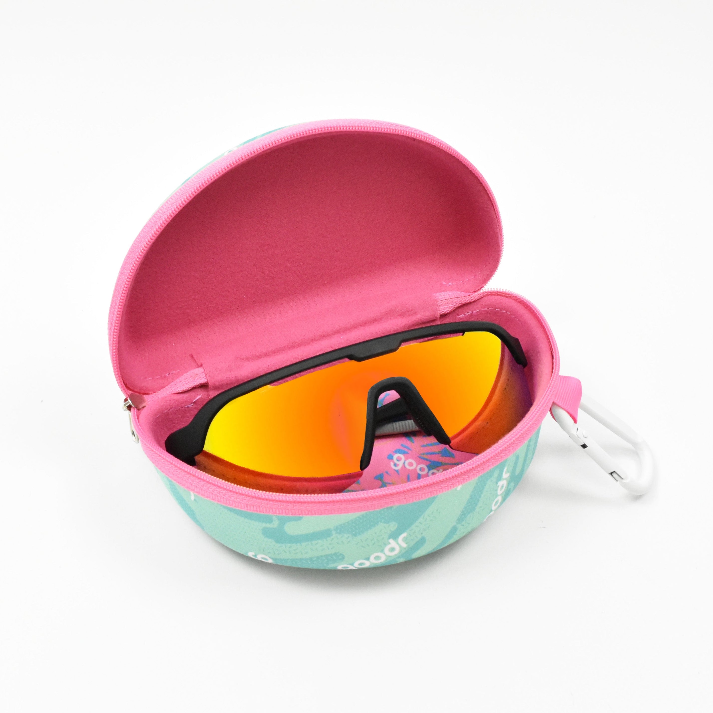 クッション性のある柔らかなライニングが付いた、ハードなサングラスケース。ジッパー開閉式で、中身が暴れても傷つきにくく、外に飛び出す心配もありません。サングラスのケアに使えるマイクロファイバークロスと、引っ掛けられるgoodrタグとセットになったカラビナ付き。