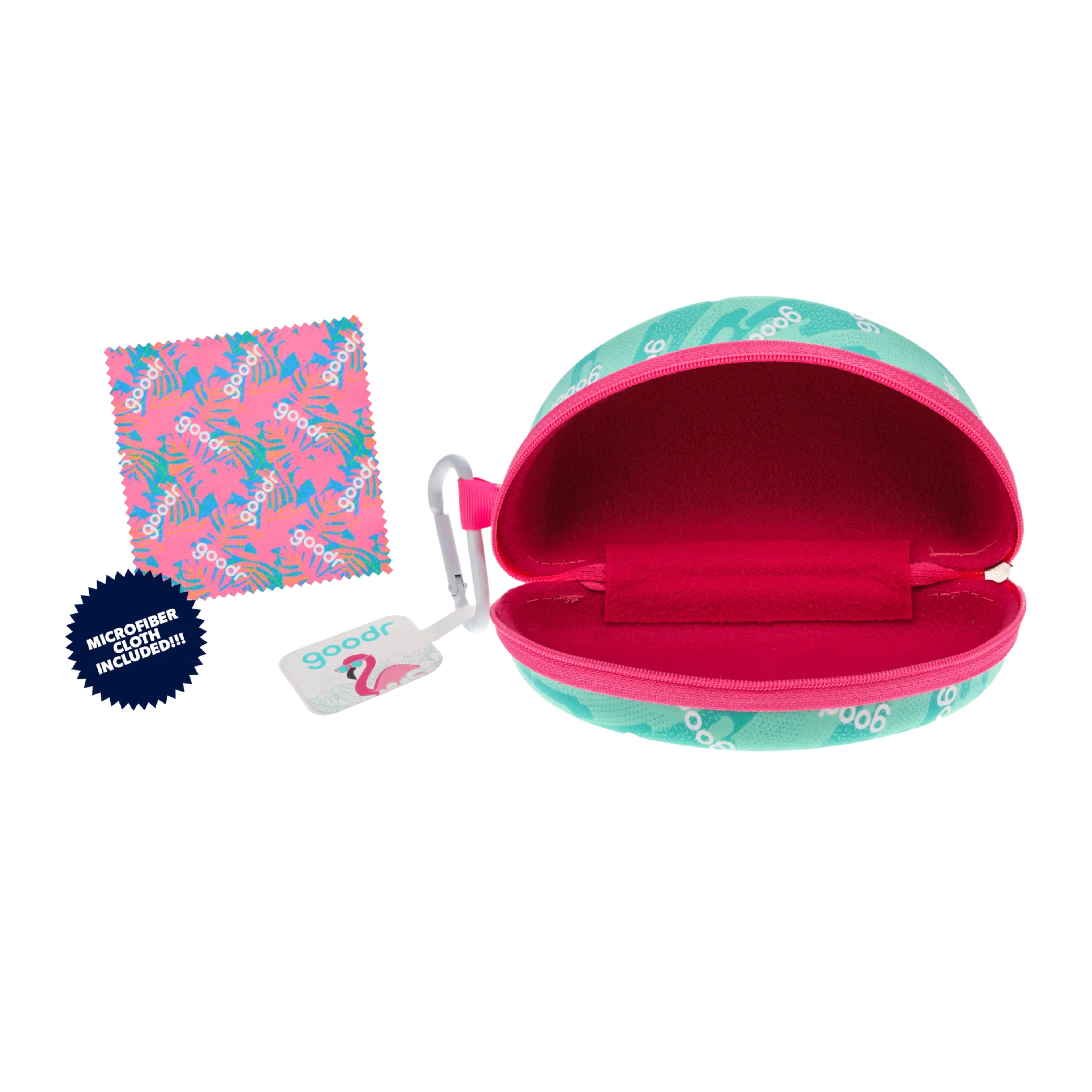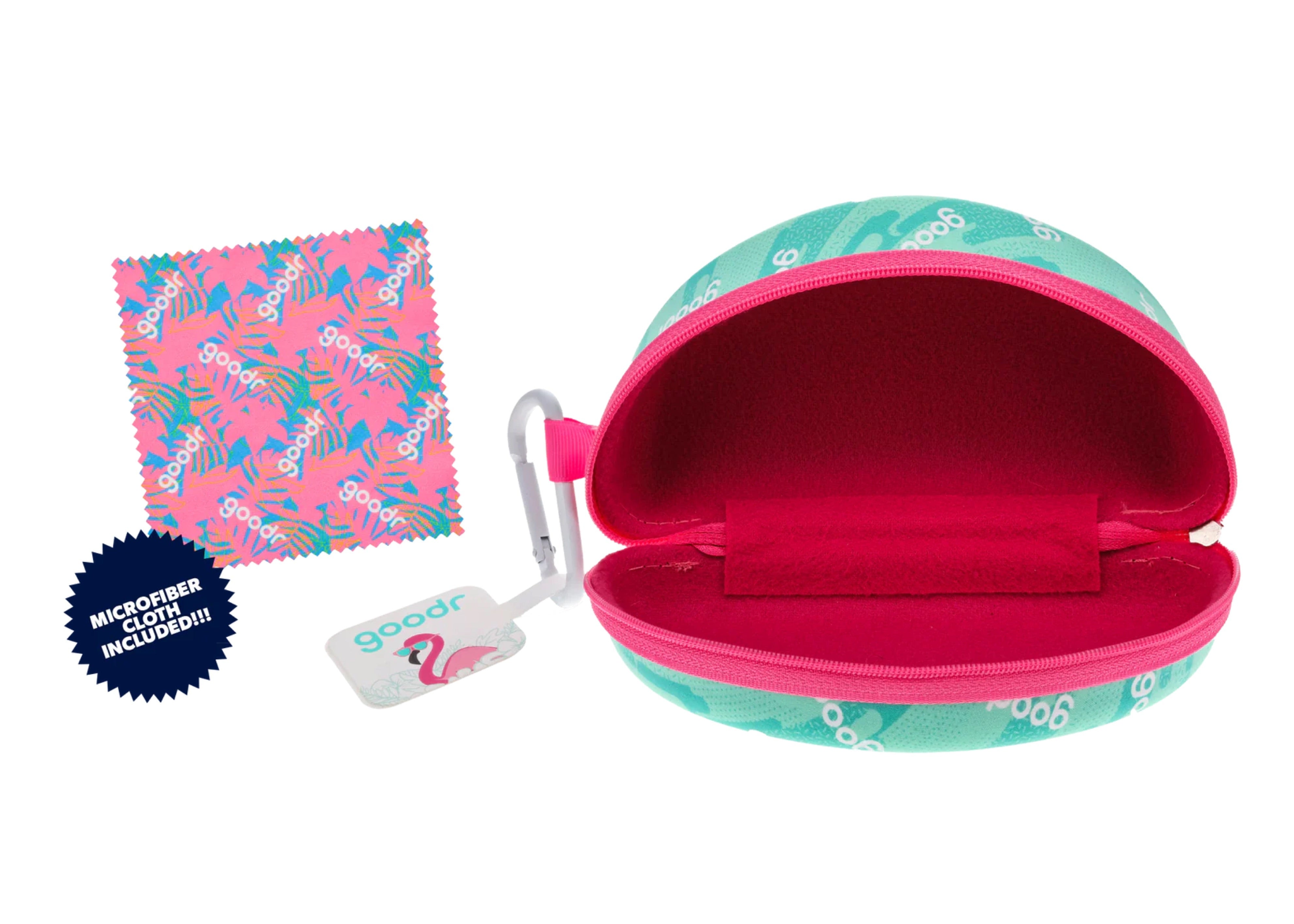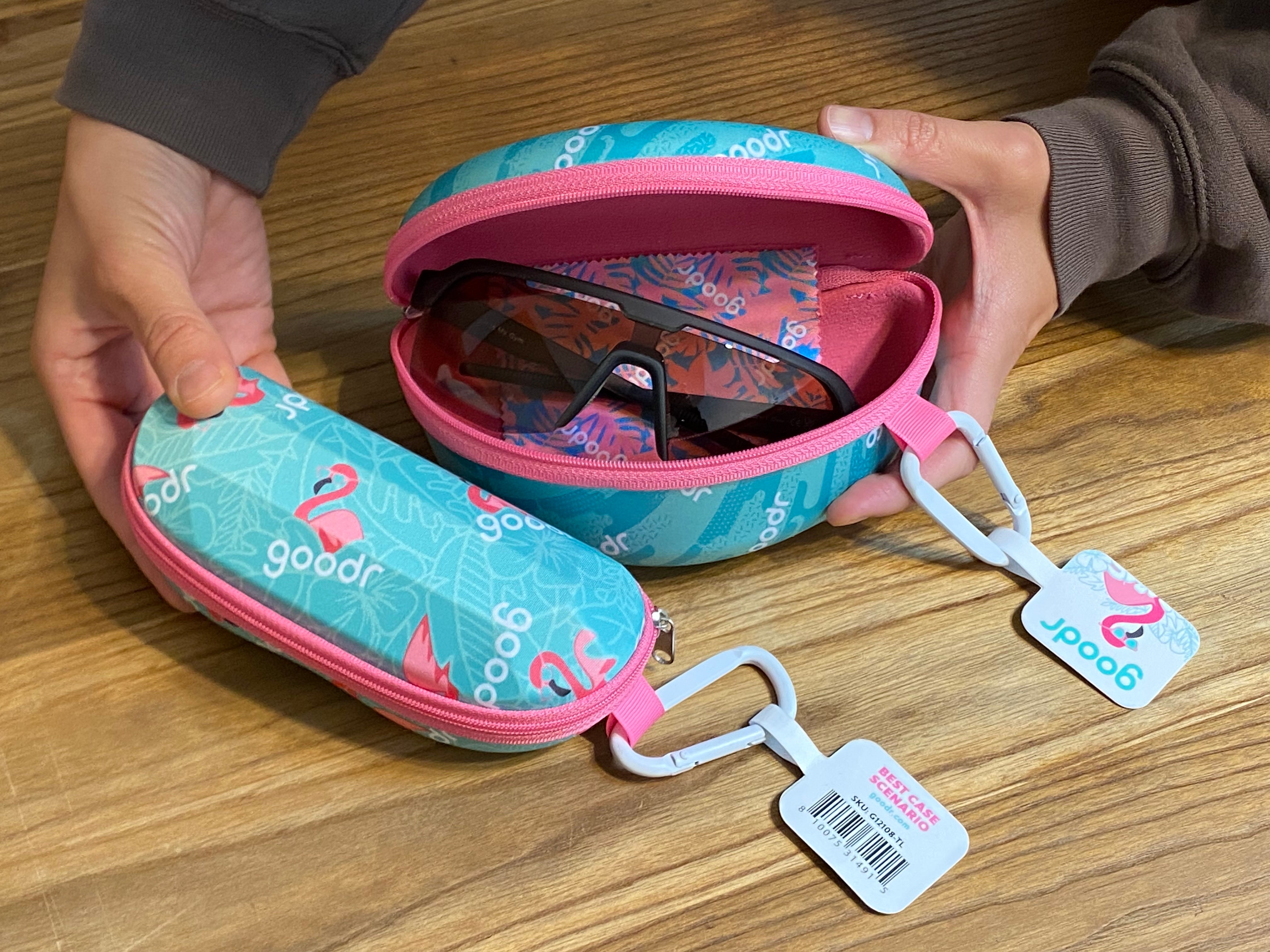 グダーを象徴するフラミンゴと、ティール×ピンクのカラーリングが眩しい、少し大きめのラップレンズサングラスもしっかり収納できるサングラスケース。定番のOGやCGの収納に適したケース「ベスト ケース シナリオ」と比較すると、ひと回り大きい「BOLT G」なども収納しやすいサイズになっています。