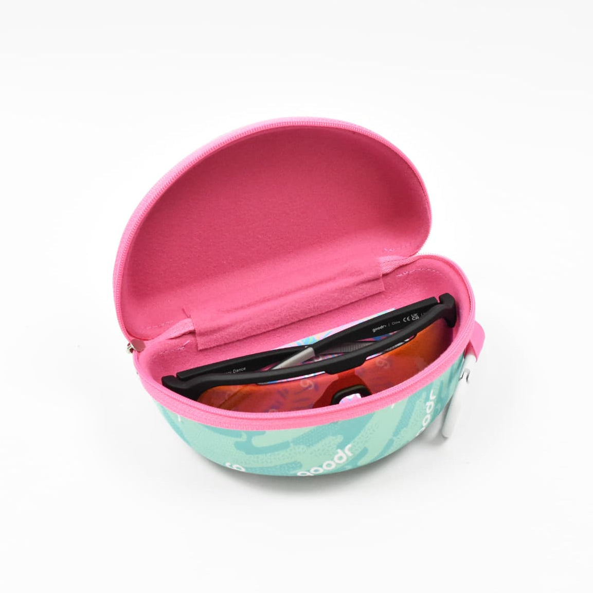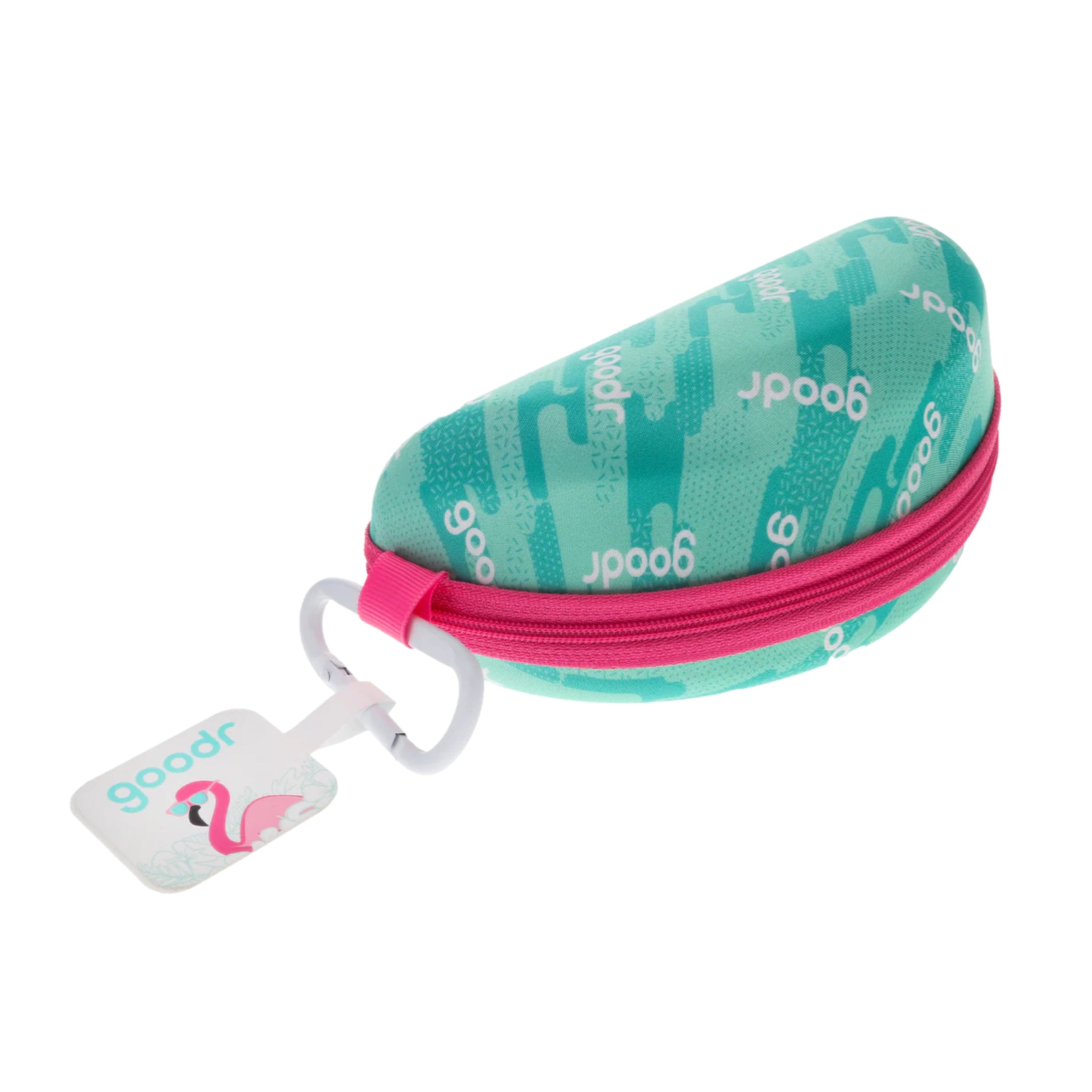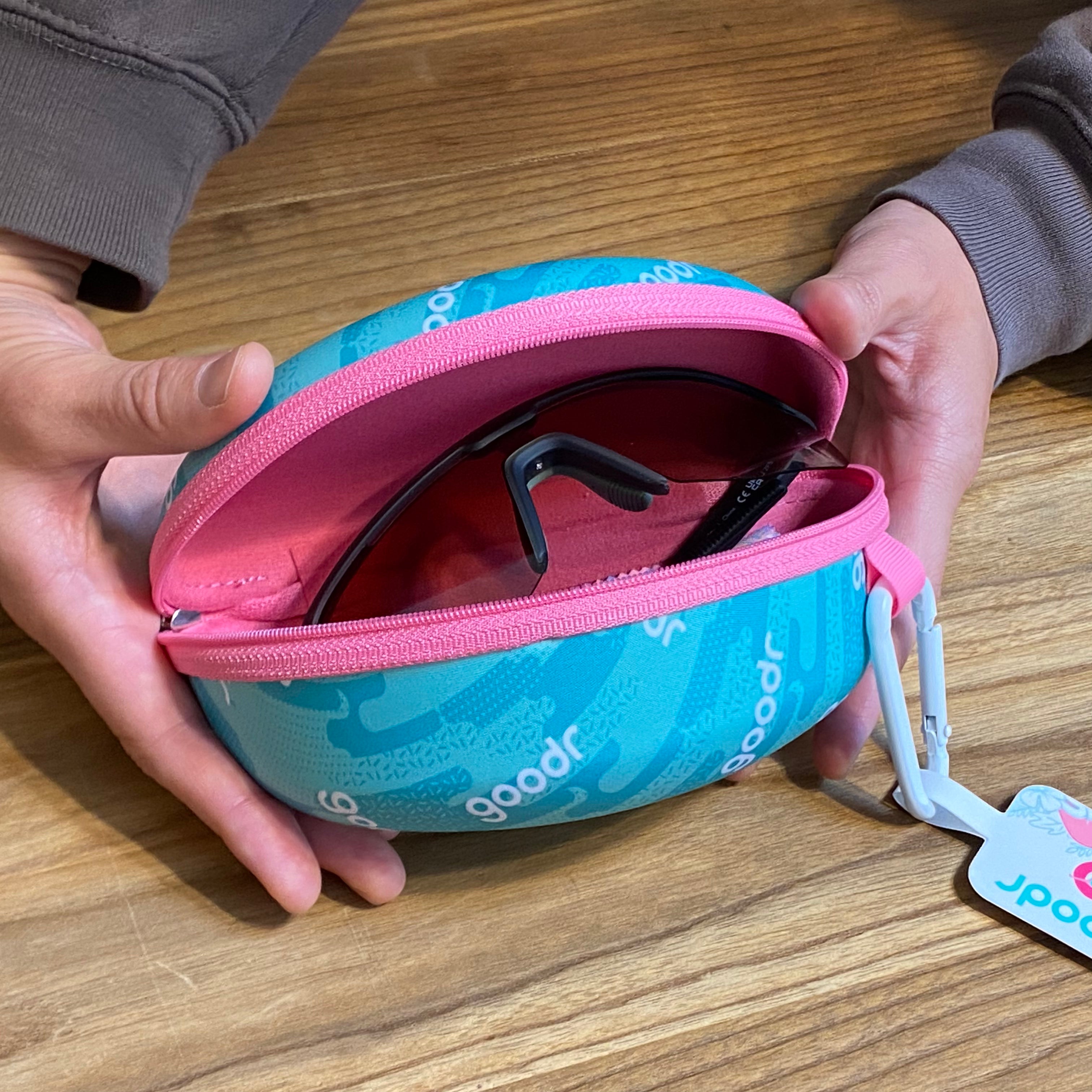 グダーを象徴するフラミンゴと、ティール×ピンクのカラーリングが眩しい、少し大きめのラップレンズサングラスもしっかり収納できるサングラスケース。定番のOGやCGの収納に適したケース「ベスト ケース シナリオ」と比較すると、ひと回り大きい「BOLT G」なども収納しやすいサイズになっています。