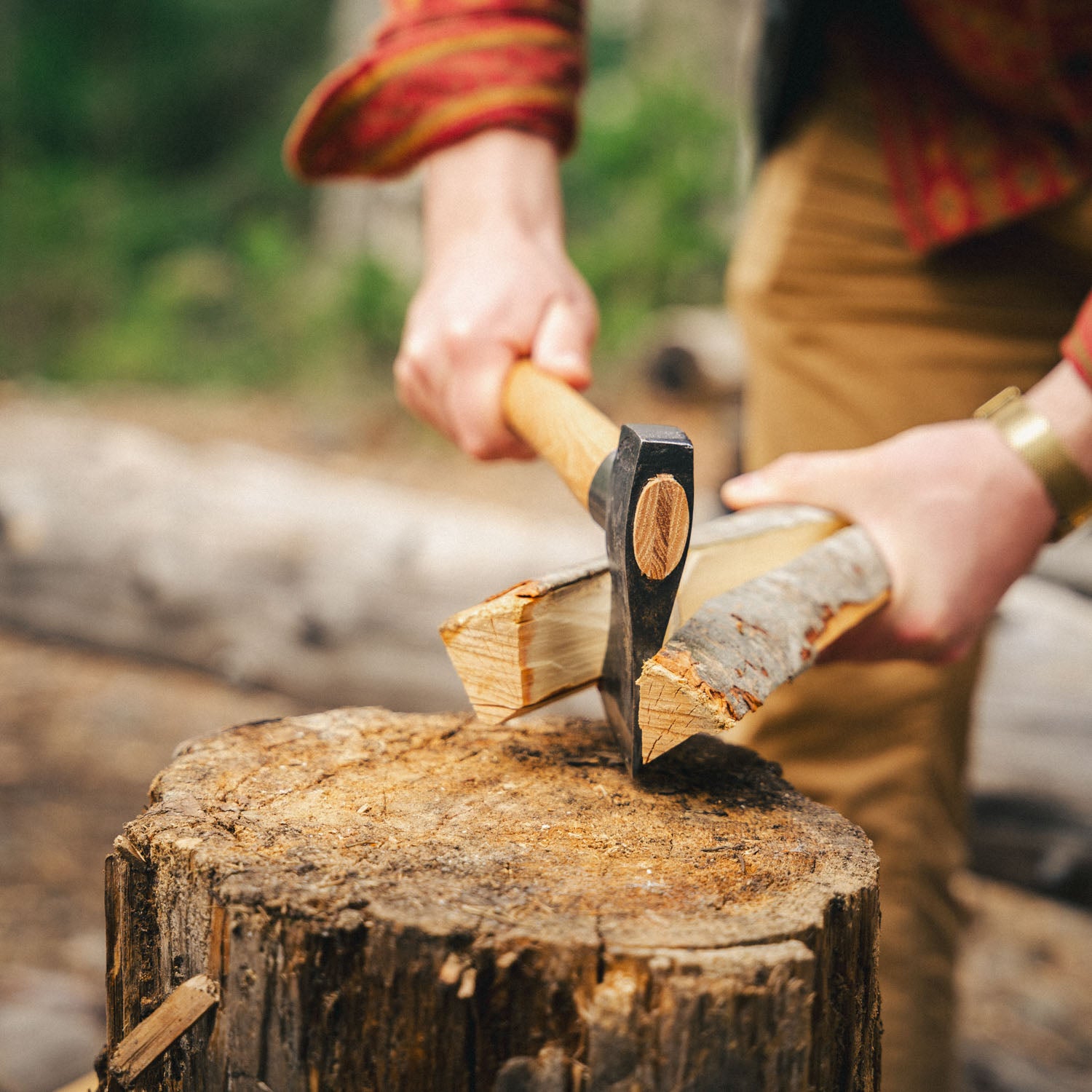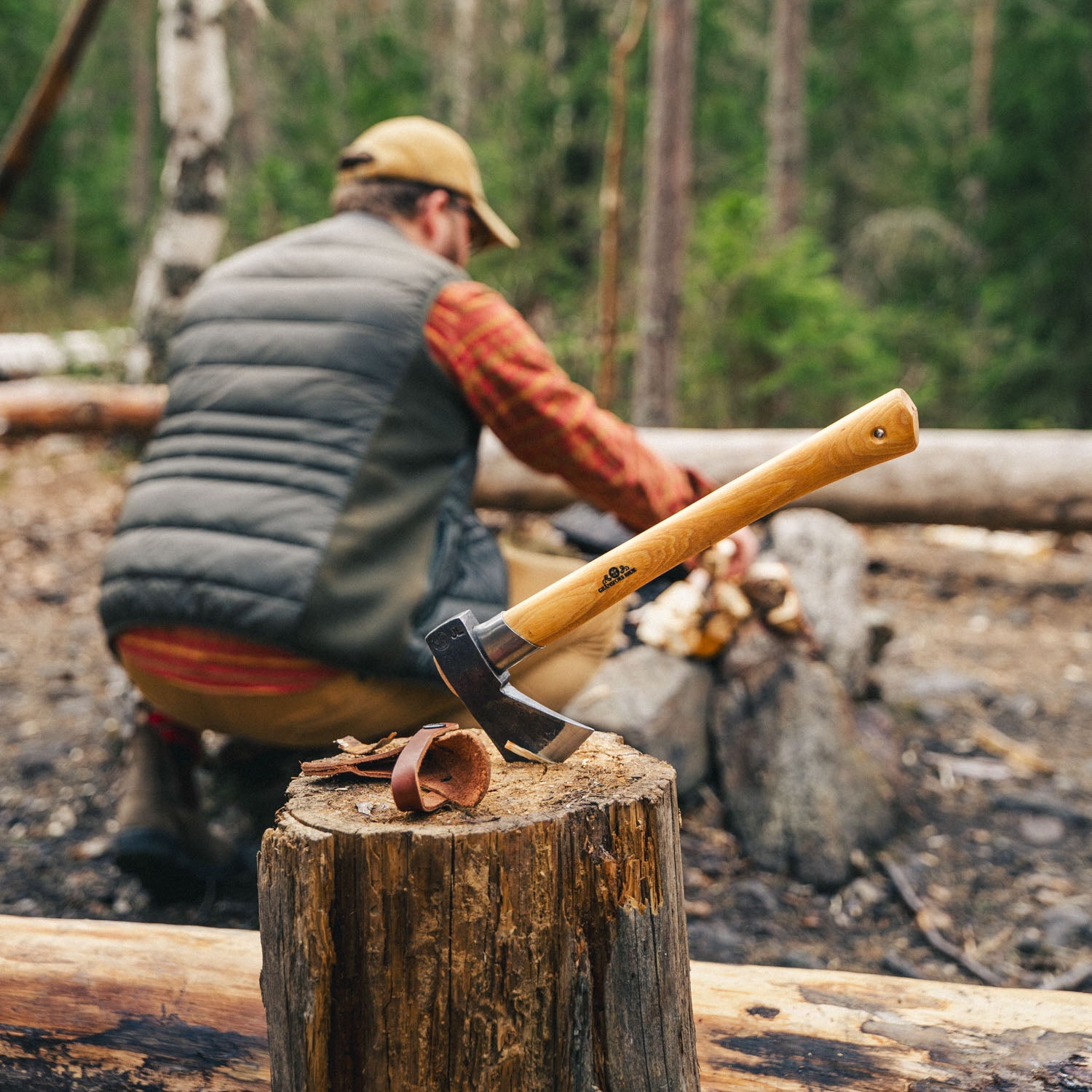アウトドアアックスはサバイバル専門家のラーズ・ファルト氏の協力の元に開発され、様々な用途でアックスを活用したい人々にとって理想的なモデルです。軽量ながらも、比較的長いハンドルと重く長めに設計されたヘッドが、木を切り倒すのに十分な威力を発揮し、枝払いにも最適です。ハンドルには金属製の保護カバーが取り付けられており、簡単な薪割にも使用可能で、大型のナイフとしての役割も果たします。