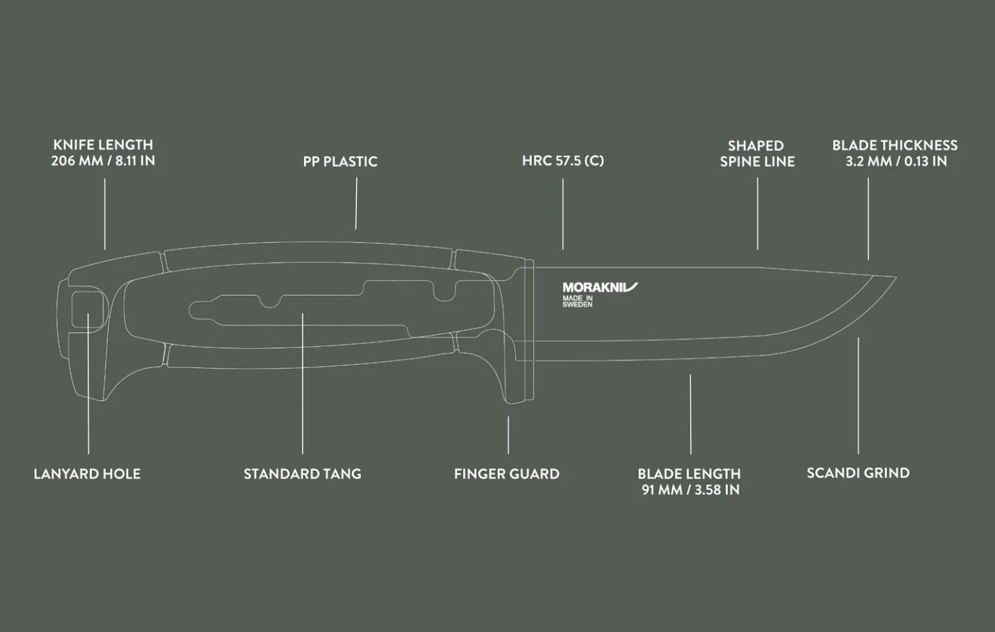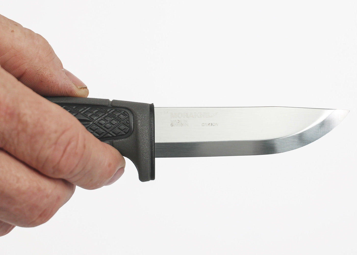 長さ91mm、厚さ3.2mmのブレードで、鋭い切れ味を備えた高品質のカーボンスチールは、ドイツの「WAELZHOLZ」社の炭素鋼を使用し、モーラナイフ独自の加工を施しています。1%の炭素を含むブレードは、長期間にわたって最大の切れ味を発揮するよう研ぎ直しがしやすくなっており、靭性のある吸い付くような切り心地が特徴です。ブレードはハンドル内部3分の2ほどまで延びており、刃元での作業時にも優れたコントロール性と力の伝達を実現します。クラシックなスカンジグラインドにより、研ぎやすく、削り出しや精密作業にも最適です。