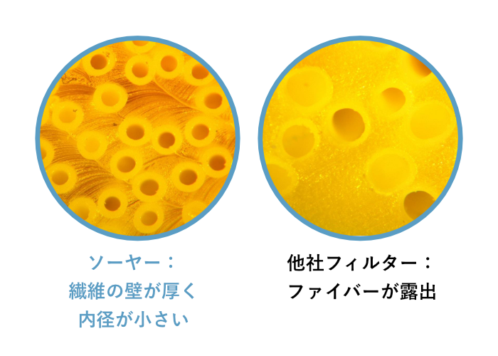ソーヤーのホロウファイバーは繊維一本一本の壁が厚く、独自調査の結果、他の主要ブランドと比較しても75%以上の強度がある事が証明されました。その為、バックフラッシュ(メンテナンス洗浄)にも耐えうる個体になり、フィルターの交換が不要かつ、1つのフィルターで38万リットルの浄水を可能にしました。1日に10リットル浄水したとして、100年以上使用できる計算で、非常に経済的でもあります。
