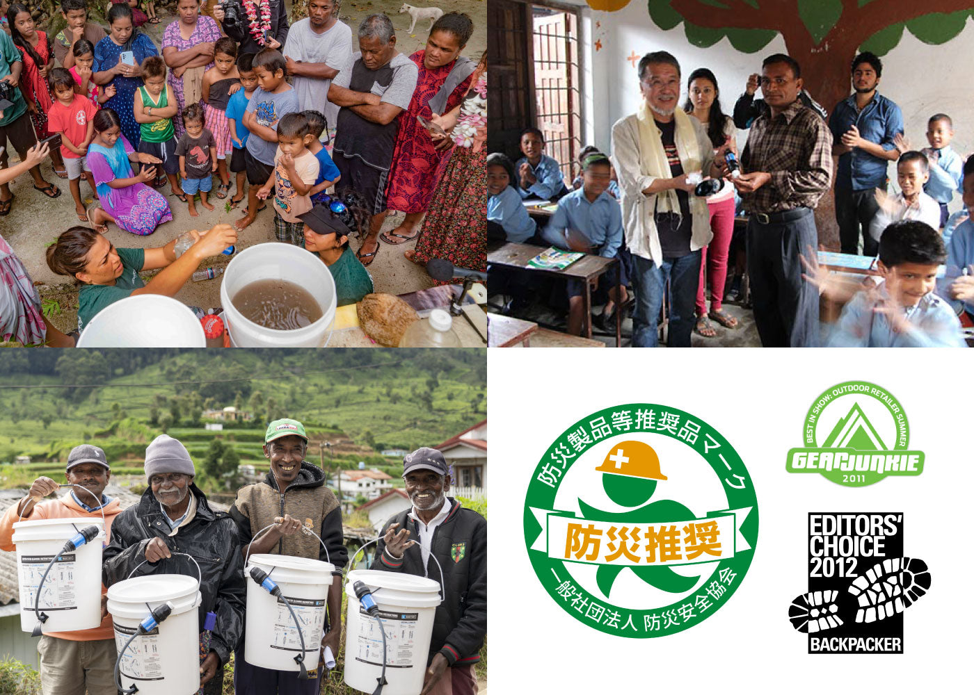 UPIでは2015年に発生したネパール大地震の際、関西学院大学の教授を通じ、スクィーズフィルターを被災地に提供しています(写真右上)。