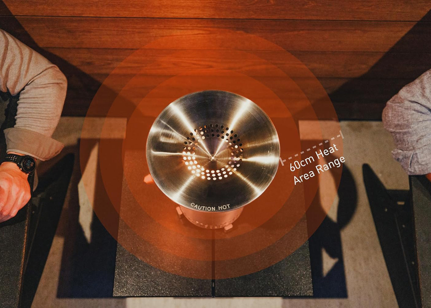 耐久性の高いステンレス製のディフレクションディスクと脚のパーツ、ベースを組み立てて、メサ XL本体に載せるだけ。簡単にセッティングが可能です。ヒートディフレクターとメサ本体の間に空気の流れができ、より効率的に2次燃焼が促され、暖かい空気層が広がるとともに、ディスクの裏側に跳ね返った焚き火の熱が手元やテーブル全体に広がります。環境により異なりますが、周囲の温度を最大約14℃上昇、熱の広がる範囲を半径約60cmまで拡大することが期待できます。